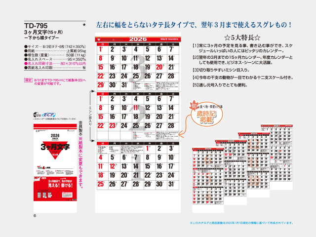 3ヶ月文字 壁掛けカレンダー【TD-795】