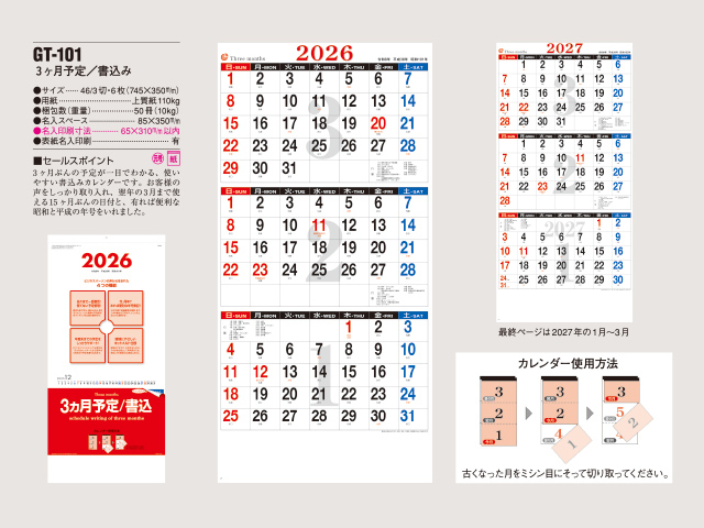 - 3ヶ月予定 壁掛けカレンダー【GT-101】