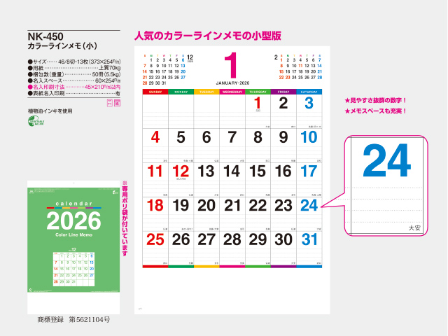 - カラーラインメモ 小 壁掛けカレンダー【NK-450】